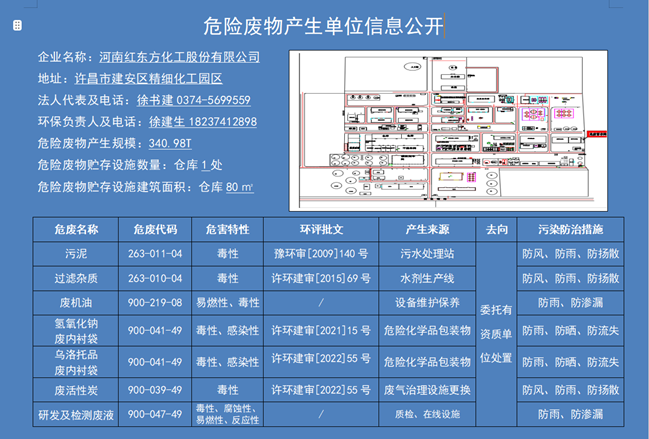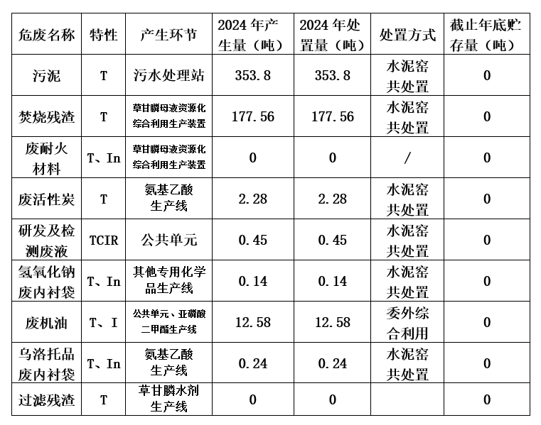 河南红东方化工股份有限公司为落实公司年度危险废物处置计划,保证公司环境安全管理工作,生产过程中产生的危废进行收集贮存,并委托河南富泉环境科技有限公司、河南思骏环保科技有限公司、河南丰达再生能源科技有限公司进行无害化处置。2024年1月1日至2024年12月31日,共产生危险废物547.05吨(2023年底剩余0吨),转移处置危险废物547.05吨,截止2024年12月31日危废暂存间有危险废物0吨,具体如下: